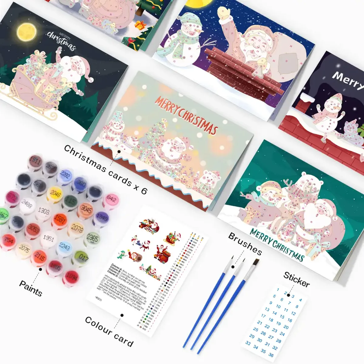Je ontvangt alle benodigde accessoires om jouw schilderen-op-nummer Kerstkaarten compleet te maken. Je krijgt de volgende tools en accessoires –- 6 Kerstkaarten