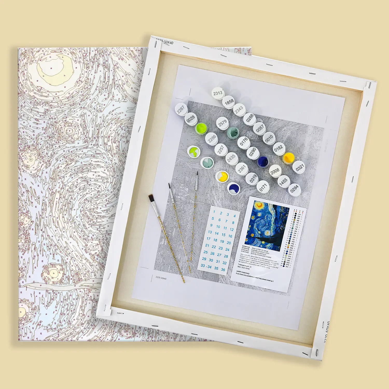 Er zijn twee opties: je kunt alleen een voorgedrukt canvas krijgen, of een ingelijst voorgedrukt canvas.Voorgedrukt canvaspakket zonder lijst omvat
