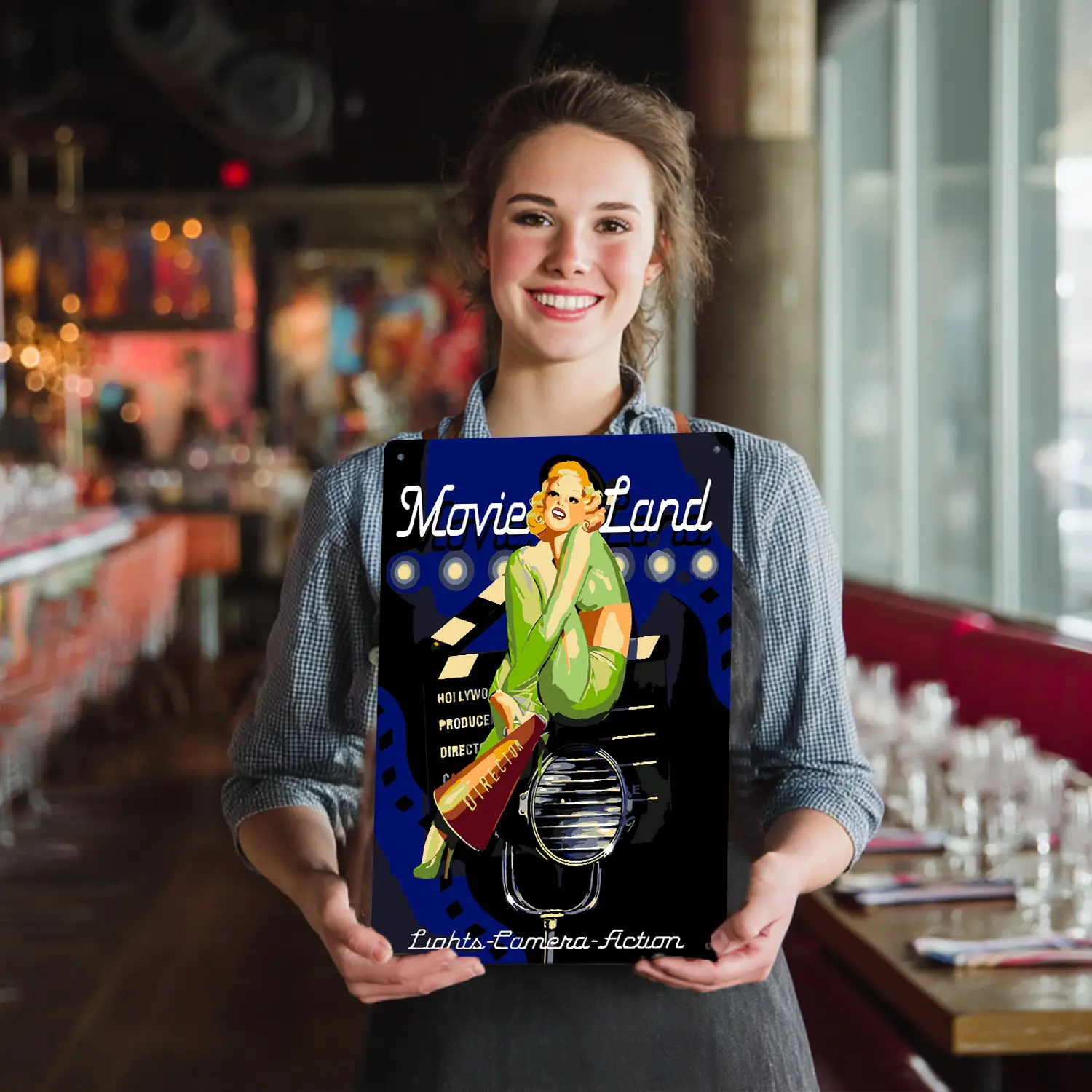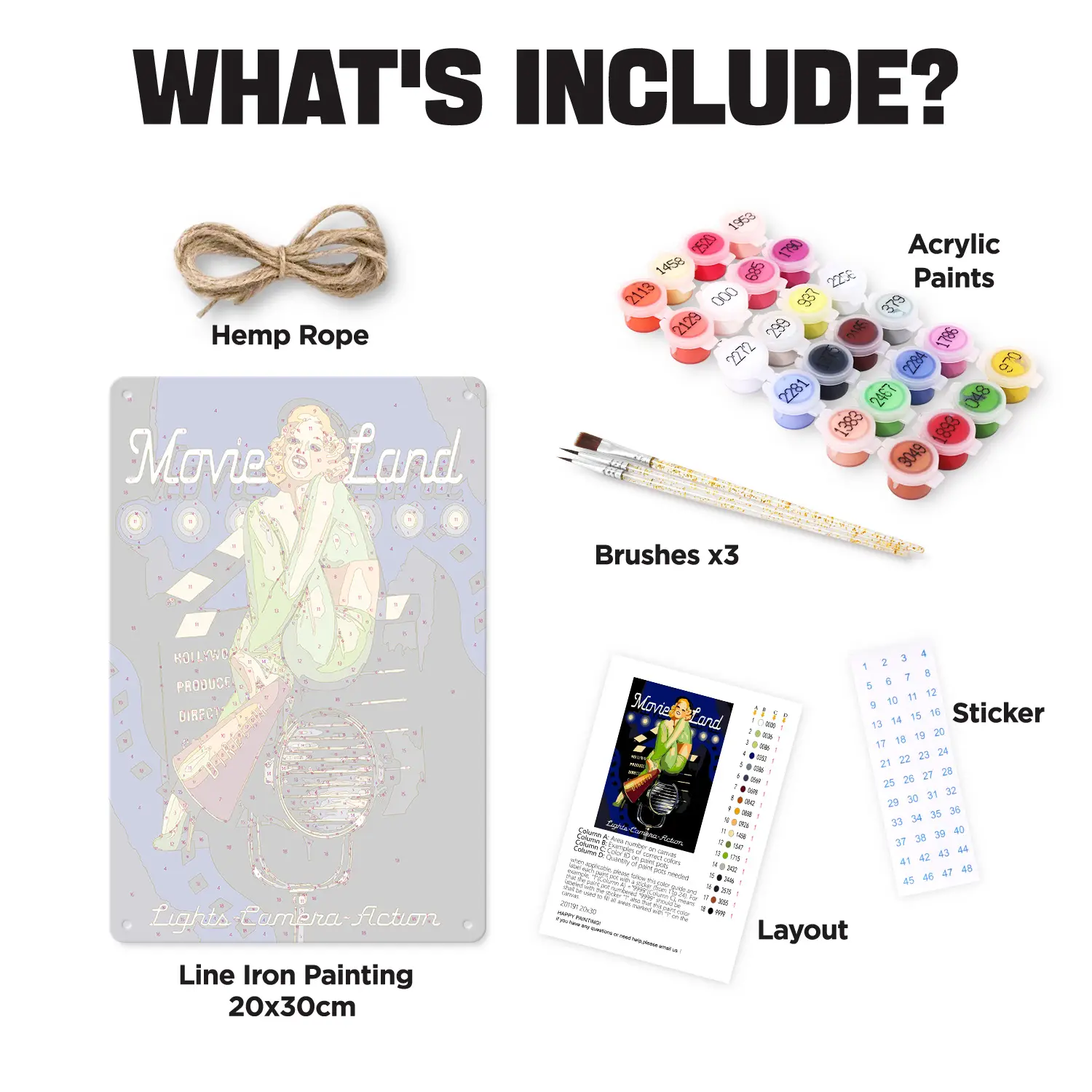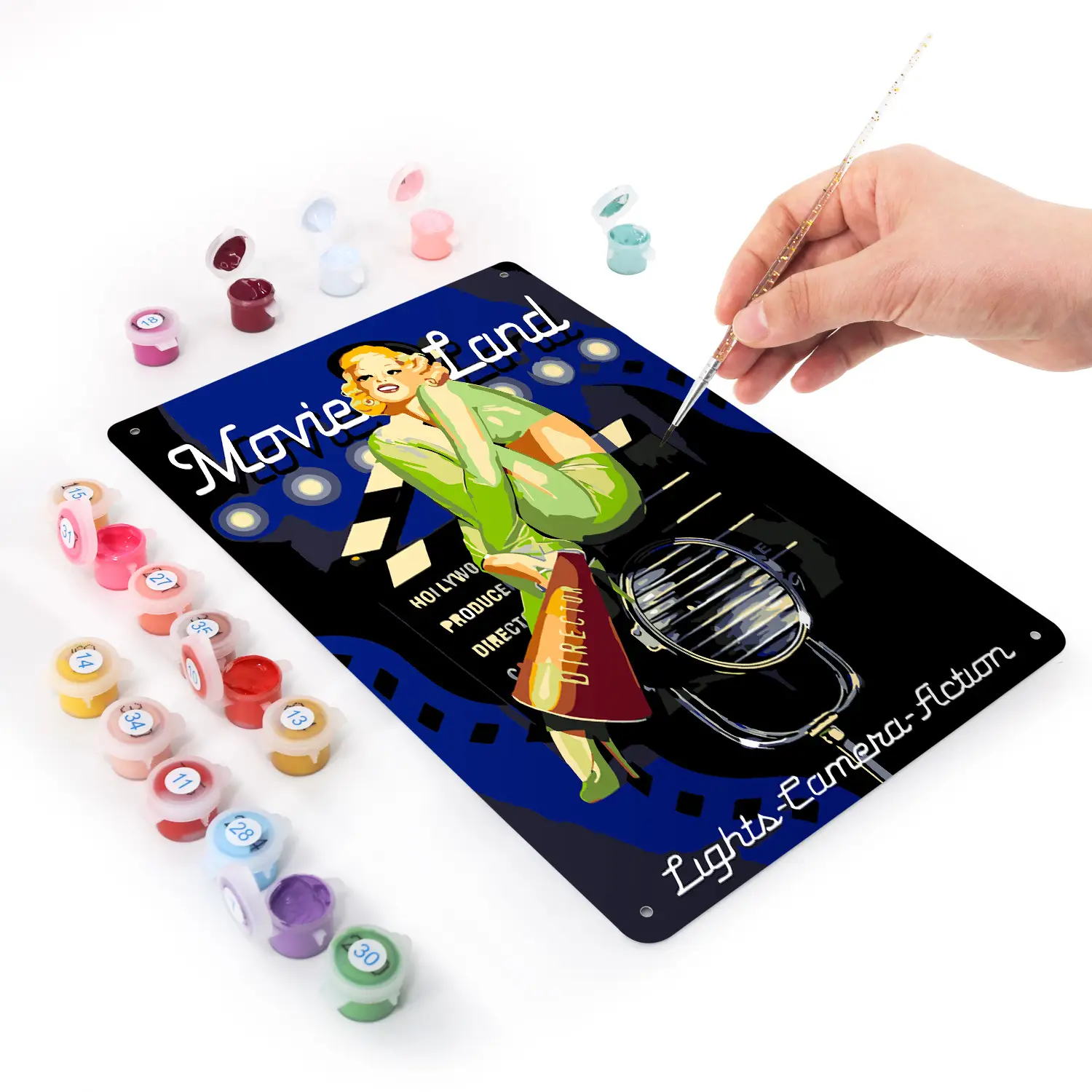 Ervaar de magie van Movie Land met onze DIY metalen poster, perfect voor het toevoegen van een vintage touch aan je huis- of bardecor. Deze 20x30cm (7.8×11.8 inch) poster heeft afgeronde hoeken en randen, wat hem een unieke uitstraling geeft. Het vintage ontwerp neemt je mee naar een nostalgisch tijdperk, waardoor het een ideaal stuk is voor liefhebbers van klassieke films. Geniet van het creatieve proces van schilderen op nummer, en breng deze metalen poster tot leven met levendige kleuren.