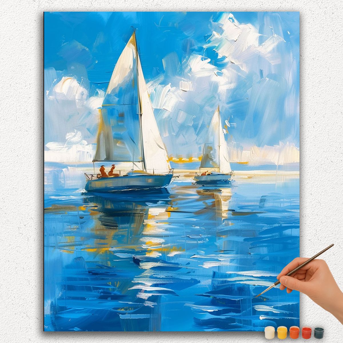 Breng de sereniteit van het oceaanleven in huis met onze “Twee Boten in Blauw Water” DIY schilderset. Deze schilderen op nummer set toont een kalm zeegezicht met twee boten die drijven op zacht blauw water.