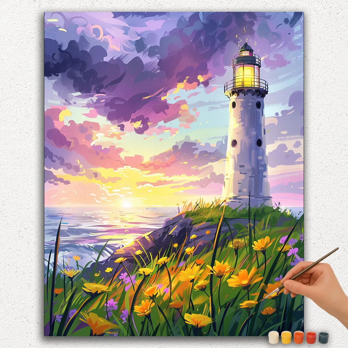 Transformeer uw ruimte met onze Vuurtoren en Bloemenveld DIY Schilderset. Deze prachtige scène toont een majestueuze vuurtoren die hoog boven een levendig veld van kleurrijke bloemen uittorent.
