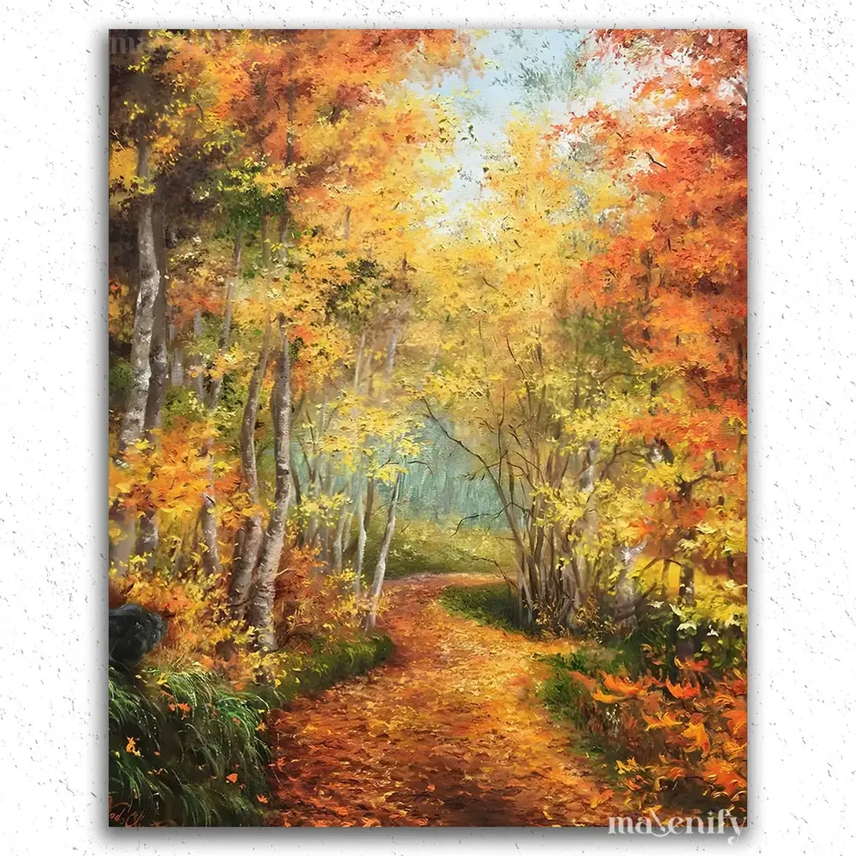 Omarm de warmte van het seizoen met de Weg naar de Herfst Schilderen op Nummer Kit. Dit prachtige DIY-kunstwerk vangt de levendige tinten en gezellige sfeer van de herfst, perfect voor het decoreren van je huis of als cadeau voor dierbaren. Het is een ontspannende creatieve activiteit die de schoonheid van de natuur tot leven brengt.
