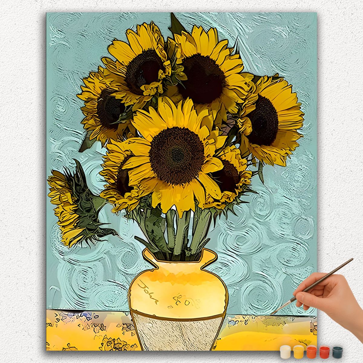 Breng de warmte van de zomer in huis met onze Zonnebloemen in Vaas Doe-het-zelf Schilderpakket. Met deze schilderen op nummer set creëert u een prachtig kunstwerk van heldergele zonnebloemen, gearrangeerd in een klassieke blauwe vaas.
